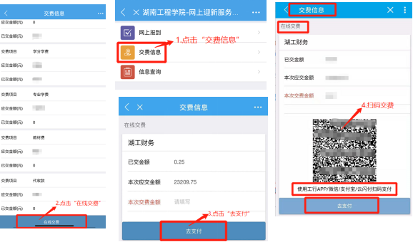 专升本学生可使用工行APP/云闪付/微信/支付宝扫码支付,在对应平台完成学杂费交费手续。