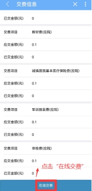 第一步:登录“易班”APP,进入“新生报到”应用。完成“网上报到”后,点击“交费信息”,查看应交费明细。(交费时间:8月20日至9月7日(每天7:00-23:00))。