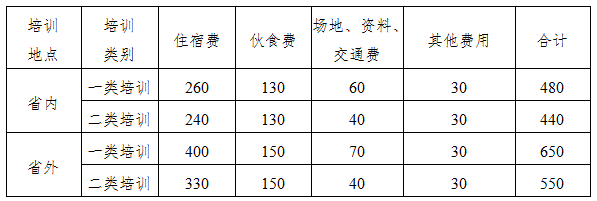 第八条 除师资费外,培训费实行分类综合定额标准,分项核定、总额控制,各项费用之间可适当调剂使用。综合定额标准如下: