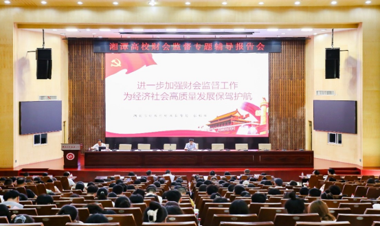 为进一步推动湘潭高校广大财务人员深入学习宣传贯彻中共中央办公厅、国务院办公厅《关于进一步加强财会监督工作的意见》(以下简称《意见》)和湖南省委办公厅、省政府办公厅《关于进一步加强财会监督工作的实施方案》(以下简称《实施方案》),6月9日下午,湘潭高校财会监督专题辅导报告会在ok138太阳集团一报告厅举行。报告会由党委副书记、校长易兵主持,湖南省财政厅财政监督局局长、一级调研员张贻旺作辅导报告。湘潭大学、湖南科技大学、湖南工业大学等高校财务人员,以及ok138太阳集团审计人员、校直各单位相关负责人和会计学专业学生代表300余人参加了报告会。